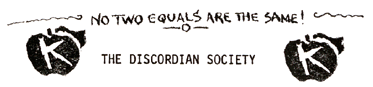 Penso ad essa alle volte come una dis-organizzazione di Freaks Erisiani E' stato anche chiamato un teatro mentale di guerriglia. IL Vescovo Fattorecasuale, Direttore delle Purghe della setta "Movimento della Nostra Gente del Mondo sommerso" di Larchmont, preferisce "La più Grande Associazione Mondiale di Qualsiasi-cosa-sia-che-siamo." Lady Mal pensa che sia da definirsi un THINK TANK RINASCIMENTALE. Fang il Non-Lavato, WKC, non ne parla. Puoi pensare di essa ciò che credi.