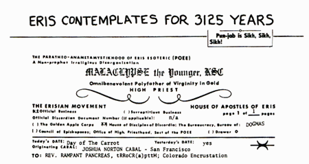 ERIS anagrammato spostando la prima lettera alla fine è RISE [NdT: "crescita"]. E leggendolo dall'interno all'esterno è REIS, che è una moneta Portoghese-Brasiliana benché non più in uso. Da ciò si può concludere che Eris ha usurpato Eros (divinità dell'amore erotico) agli occhi di coloro che che leggono al contrario il che ovviamente rende Eros sorE [NdT: "avvilito"]. Dopo di che Ella apparentemente sgraffignò il Tesoro dell'Olimpo e fuggì in Brasile dove aprì una catena di bordelli (il che sicuramente fu apprezzato dalla popolazione maschile). Lo ipotizzo sulla base del fatto che MADAM si legga allo stesso modo in entrambi i versi. E che sia un termine di grande rispetto, simile a SIRE.