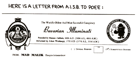 Latino da Olaus Wormius, 1132 d.C., come il Necronomicon.) Nel 1090 d.C. avvenne la fondazione della Setta Ismaeliana (Hashishim) da parte di Hassan i Sabbah, con gli insegnamenti segreti basati su Alhazred, Pelias and Kull. La fondazione degli Illuminati di Baviera, da parte di Adam Weishaupt, avvenne il 1 Maggio 1776 sulla base del lavoro degli altri. Weishaupt lo portò negli Stati Uniti durante il periodo